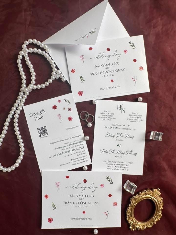 Miễn phí in nội dung (nhà trai, nhà gái, báo hỷ), miễn phí in bản đồ và mã QR, hỗ trợ in bù khi thiếu số lượng ít mà không thay đổi giá.