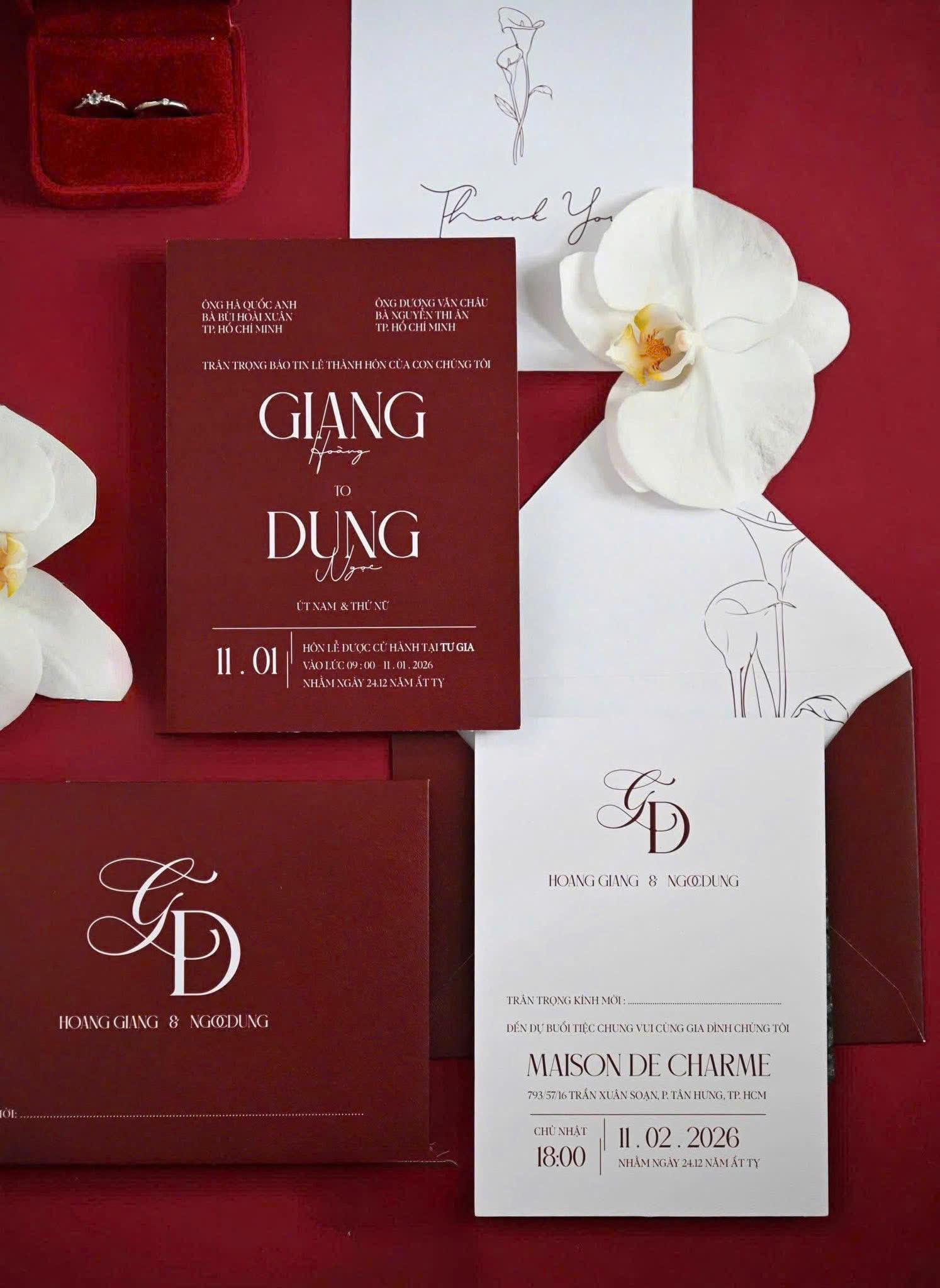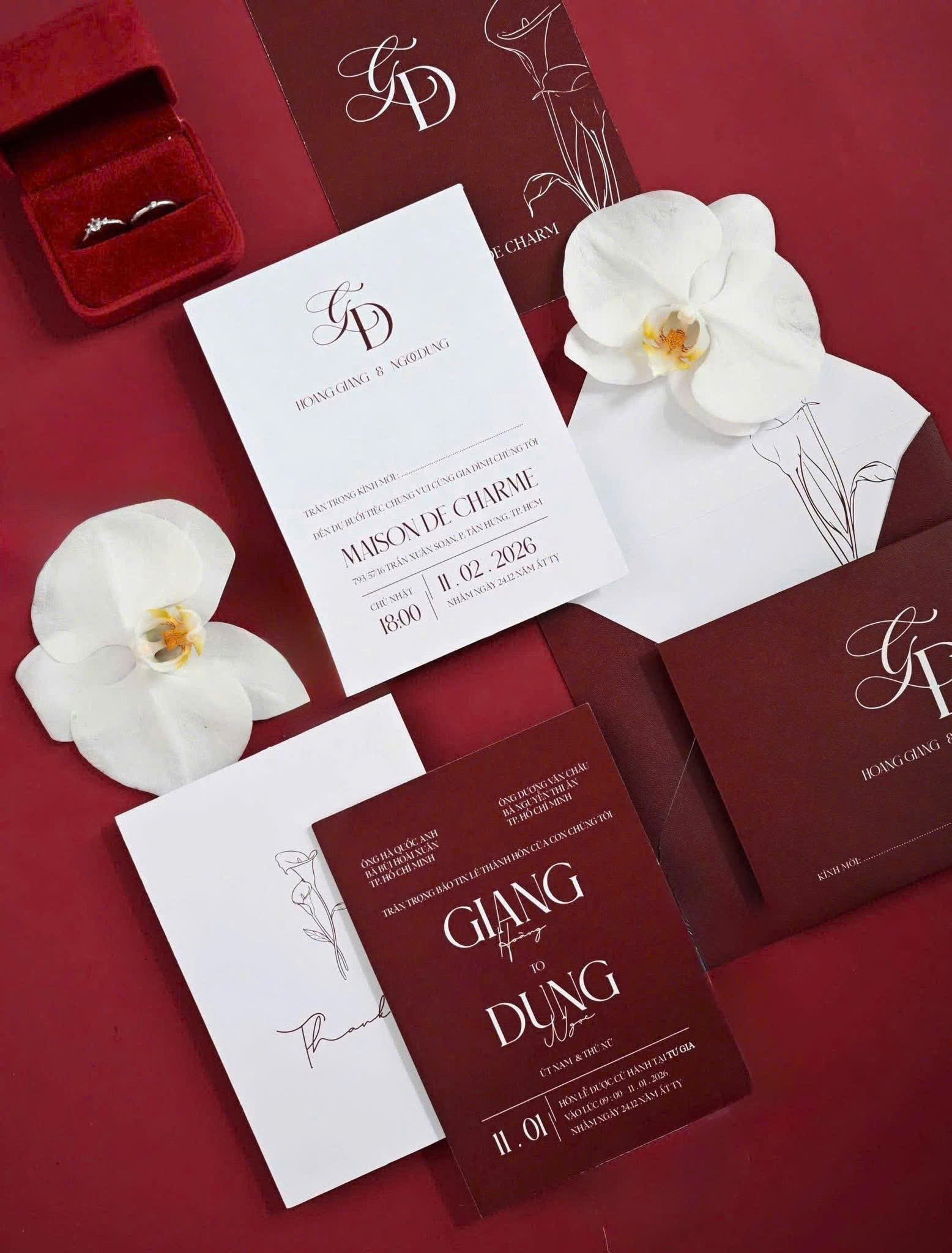 Mỗi tấm thiệp cưới đều chứa đựng những thông điệp và ước vọng tốt đẹp nhất cho tình yêu đôi lứa. Mẫu thiệp "Đỏ Nồng Nàn Tinh Tế" được thiết kế để thể hiện sự nồng nhiệt, bền chặt và sang trọng. Sắc đỏ burgundy chủ đạo tượng trưng cho tình yêu mãnh liệt, trong khi những đường nét thiết kế tối giản, thanh lịch mang đến một vẻ đẹp vượt thời gian.