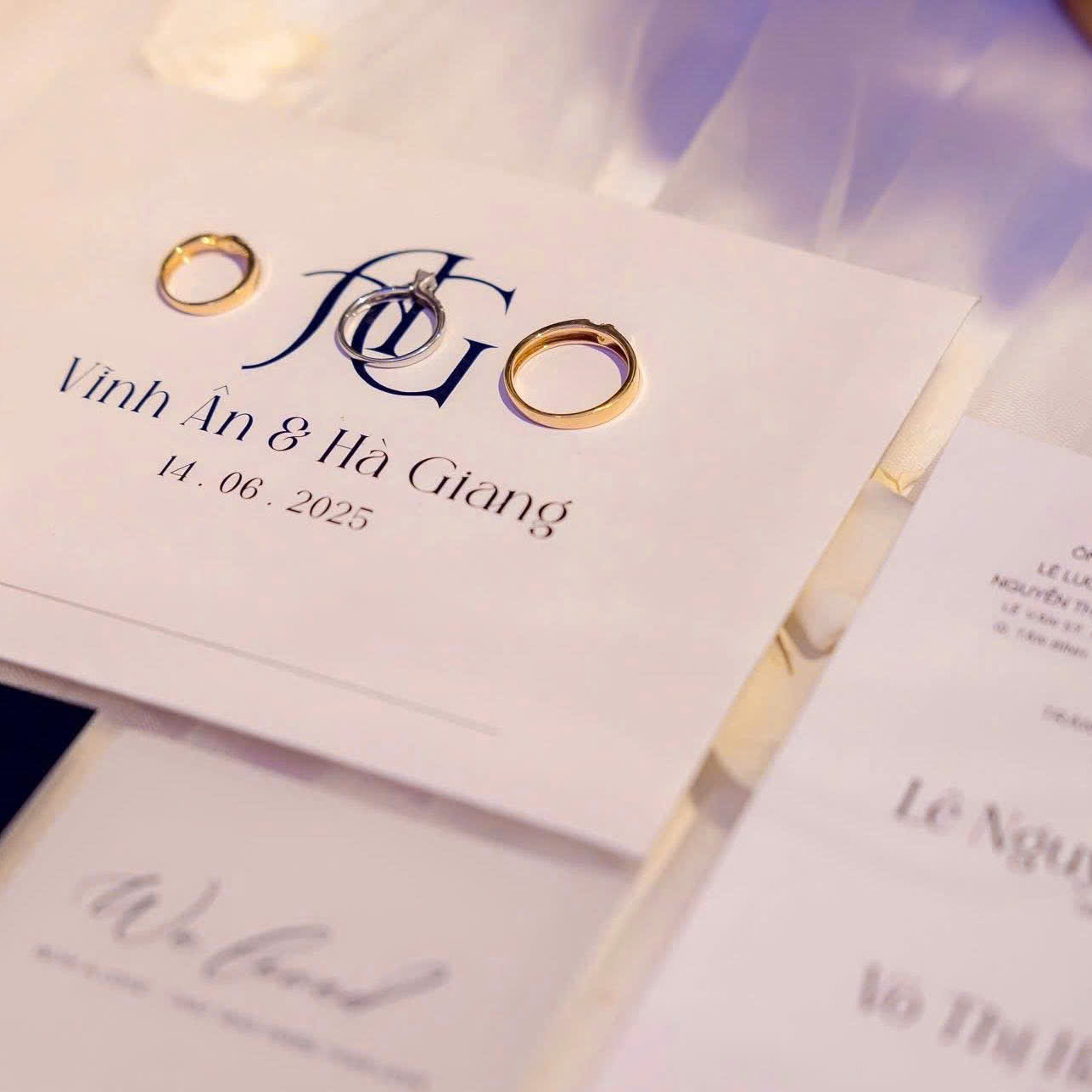 Thiết kế tập trung vào sự tối giản và biểu tượng. Điểm nhấn là hình ảnh đôi nhẫn cưới lồng ghép tinh xảo, tượng trưng cho sự gắn kết bền chặt và tình yêu vĩnh cửu. Tông màu trắng kem chủ đạo mang đến sự thuần khiết, thanh lịch, kết hợp cùng sắc xanh navy cho phần chữ viết, tạo nên sự tương phản sang trọng và hiện đại.