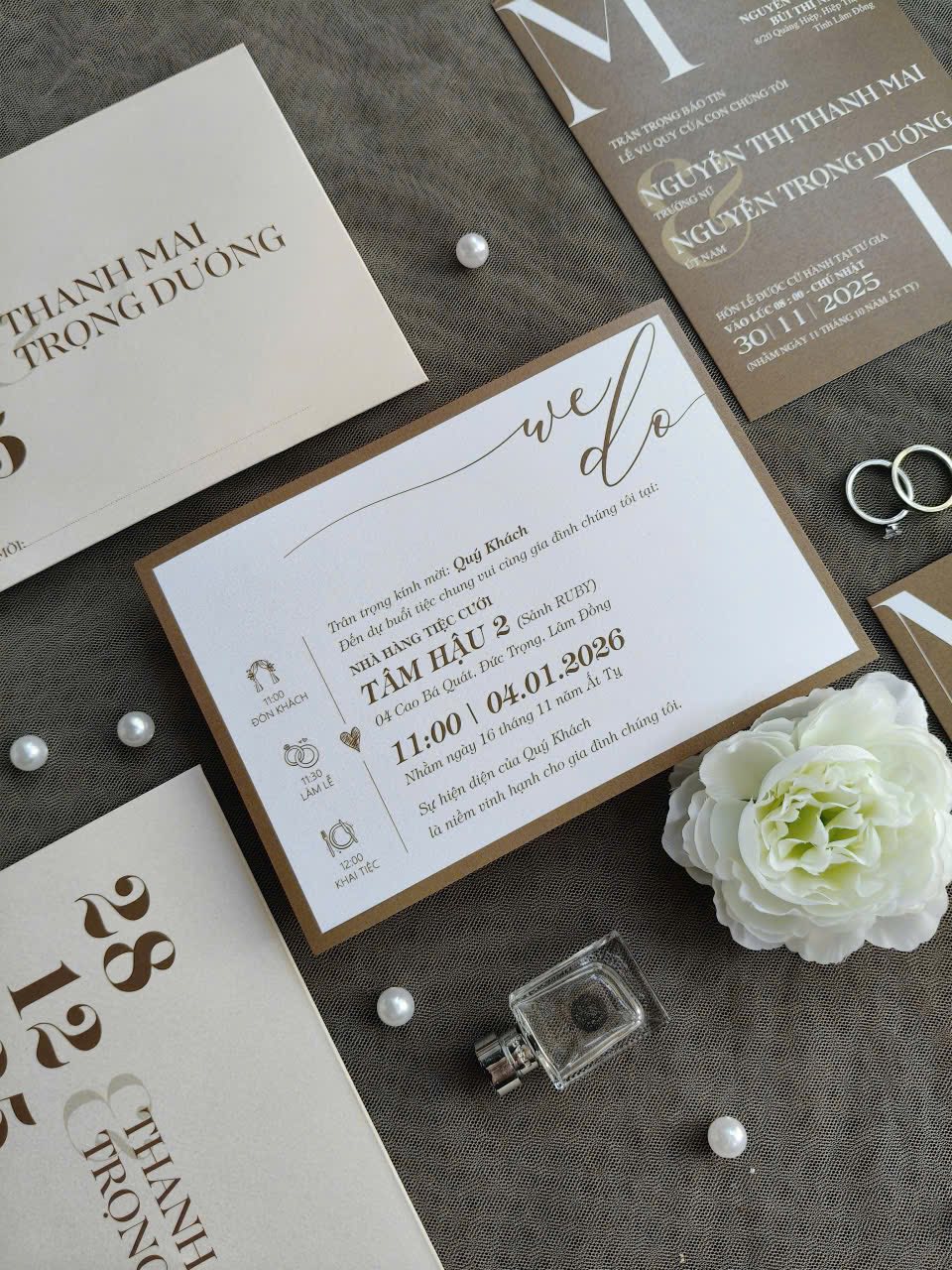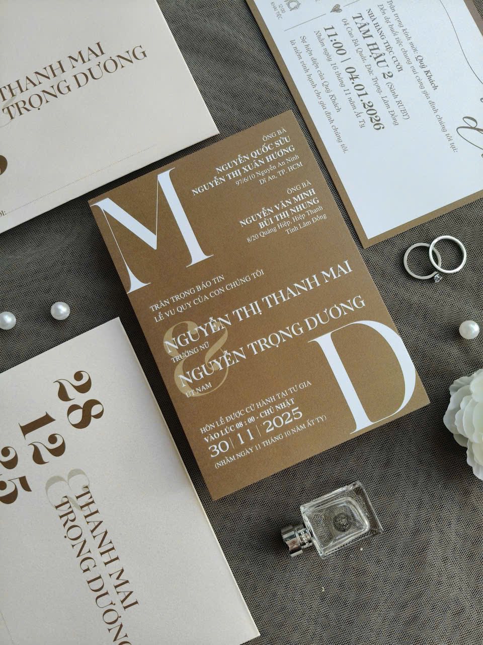 Kiểu chữ đa dạng: Sự kết hợp giữa font chữ cổ điển và hiện đại, làm nổi bật các thông tin quan trọng như ngày tháng và tên cô dâu chú rể, tạo nên phong cách độc đáo.
