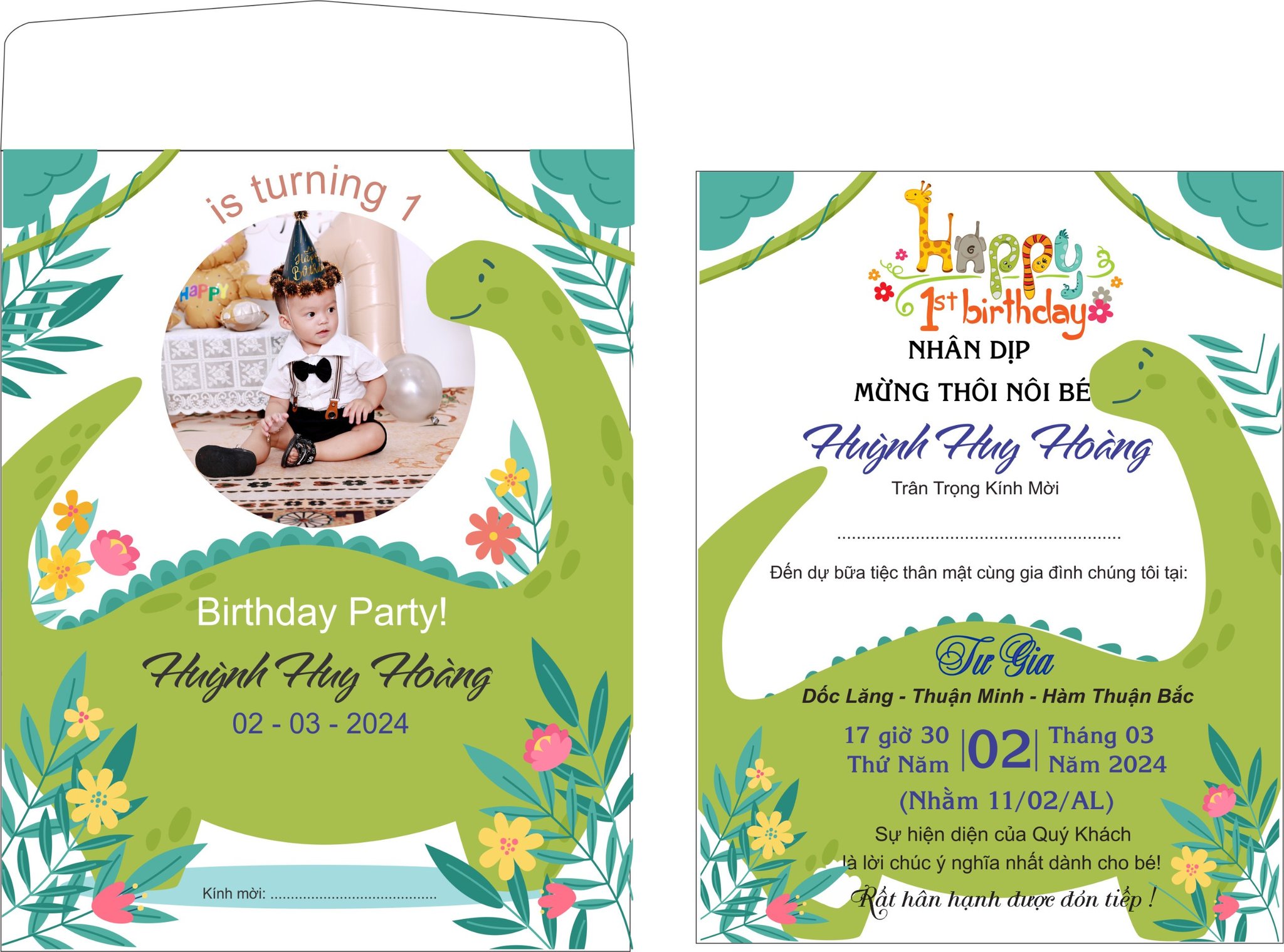 - THIỆP THÔI NÔI DINO DỄ THƯƠNG – KỶ NIỆM ĐẦU ĐỜI TRỌN VẸN Mẫu thiệp thôi nôi Dino Dễ Thương là lựa chọn hoàn hảo để ghi dấu ngày sinh nhật đầu tiên của bé với phong cách độc đáo và ấn tượng. Thiết kế chủ đề khủng long kết hợp màu xanh tươi mát, mang đến sự vui tươi và ấm áp.