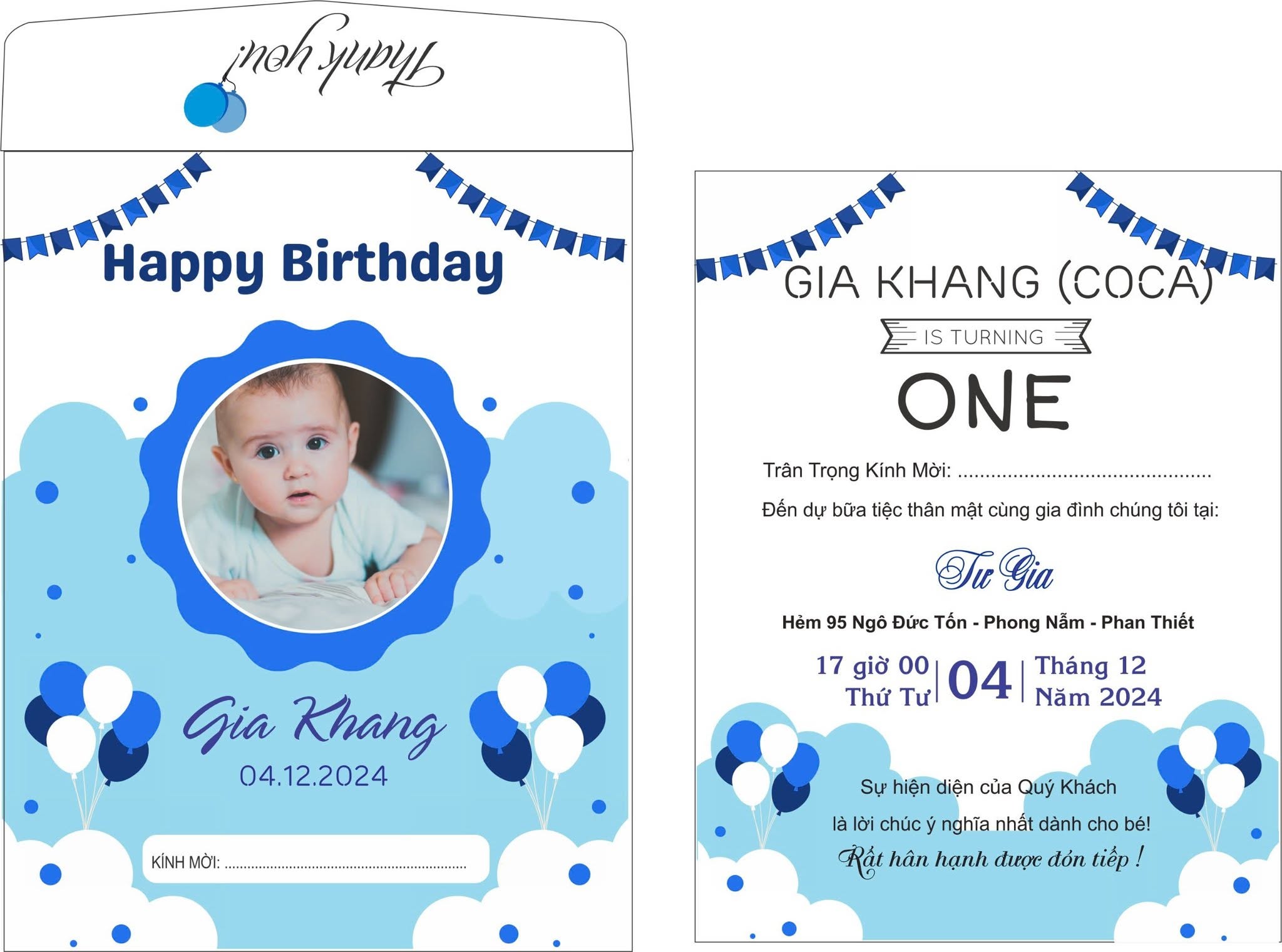Màu sắc hài hòa: Sự kết hợp giữa xanh dương và trắng tạo nên một thiết kế nhẹ nhàng nhưng không kém phần nổi bật, phù hợp với không khí vui tươi của tiệc thôi nôi.