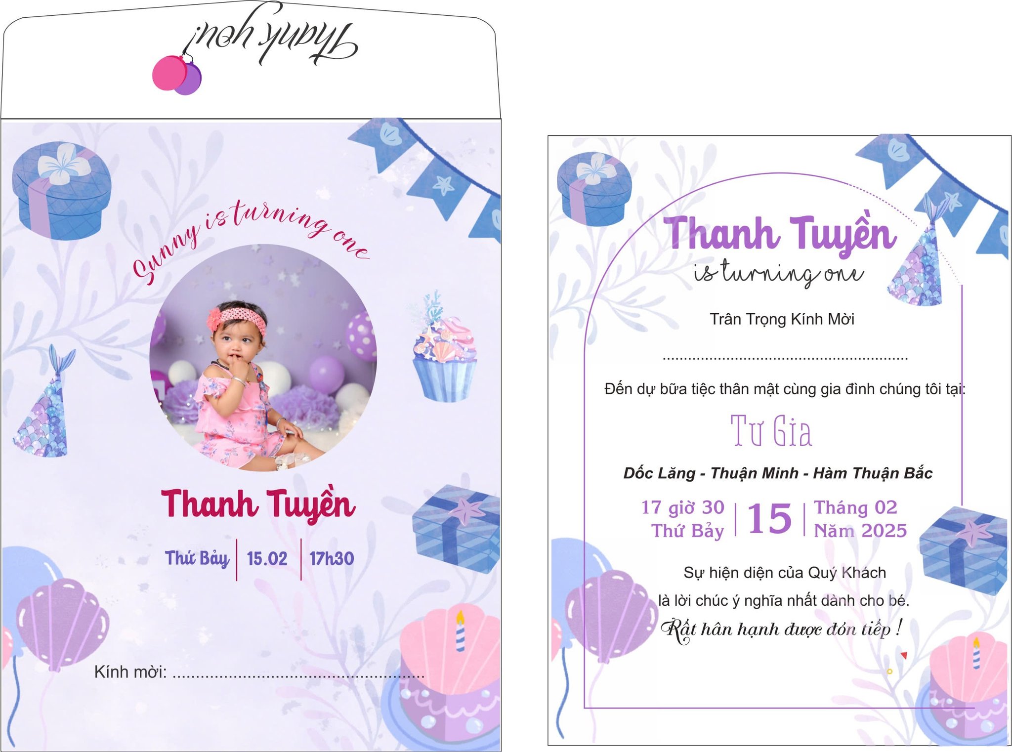 Thiệp Cưới Đồng Xoài tự hào giới thiệu mẫu thiệp thôi nôi Sắc Tím Mơ Màng, một thiết kế tinh tế và lãng mạn, dành riêng cho sự kiện mừng sinh nhật đầu tiên của bé. Mẫu thiệp này không chỉ là lời mời mà còn là một kỷ vật lưu giữ khoảnh khắc quý giá trong hành trình lớn khôn của thiên thần nhỏ, thể hiện sự trân trọng của gia đình.