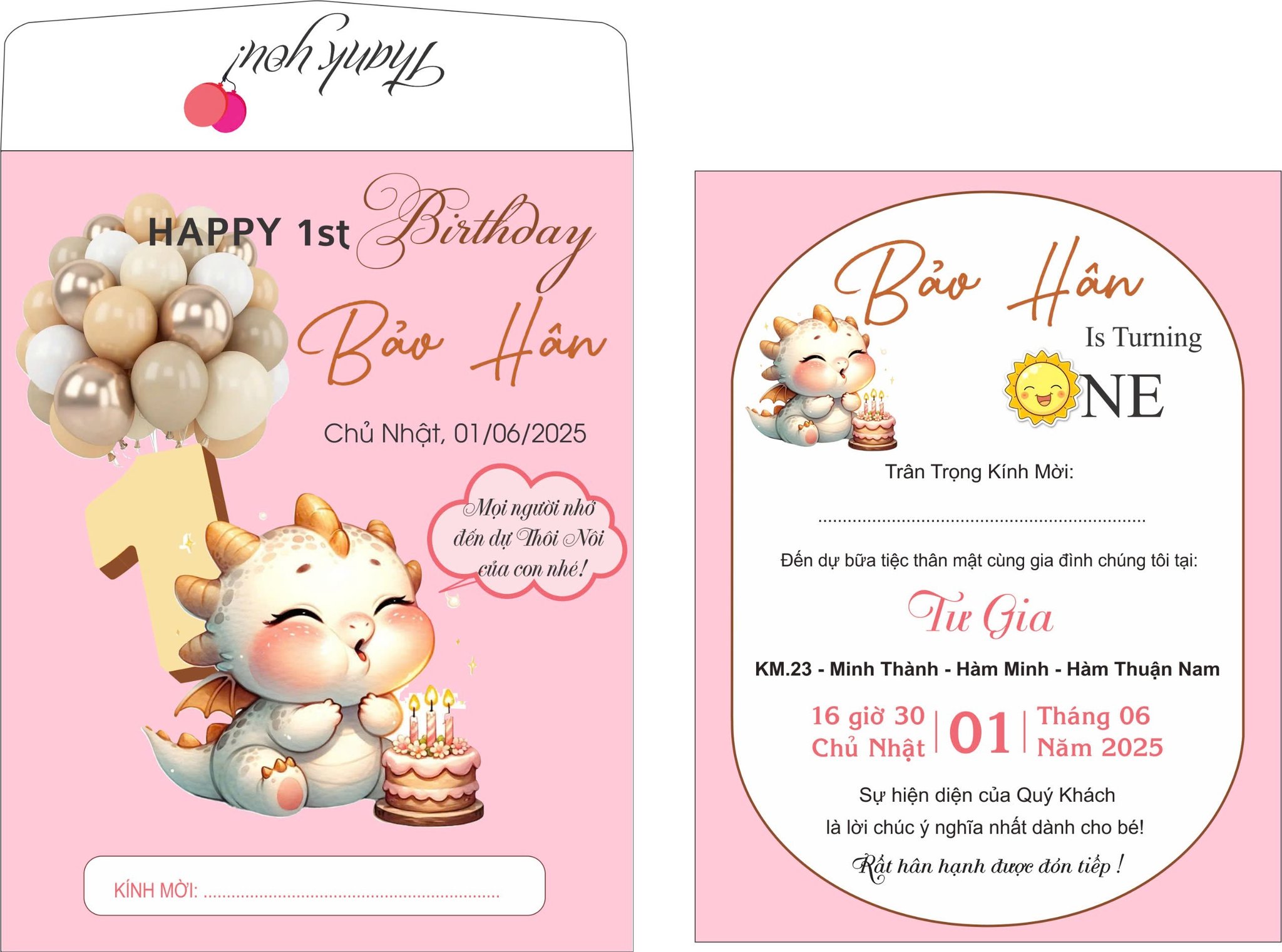 - THIỆP THÔI NÔI RỒNG CON THANH LỊCH – CHÀO ĐÓN SINH NHẬT ĐẦU ĐỜI ĐẦY ẤM ÁP Mẫu thiệp thôi nôi "Rồng Con Thanh Lịch" mang đến sự kết hợp hoàn hảo giữa nét đáng yêu, tinh tế và sang trọng, lý tưởng để kỷ niệm sinh nhật đầu tiên của bé. Thiết kế độc đáo với hình ảnh rồng con, tông màu hồng pastel và vàng kem ấm áp.