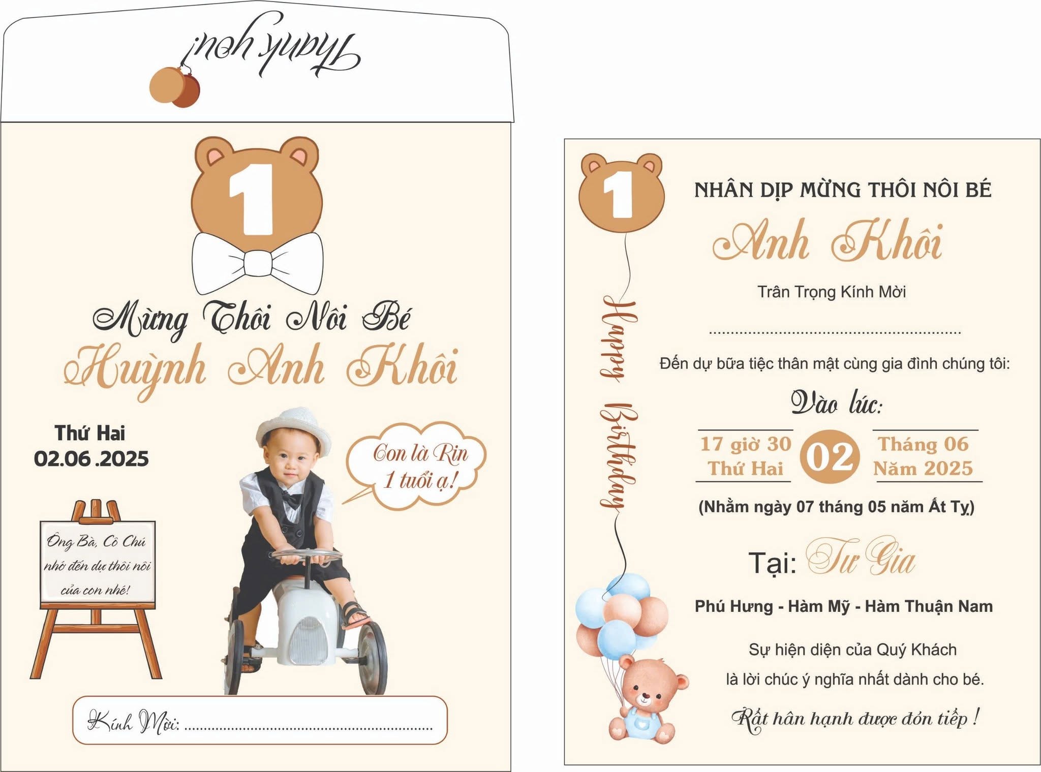 Thiệp Thôi Nôi Gấu Con Tinh Tế của Thiệp Cưới Đồng Xoài được thiết kế dành riêng cho cột mốc sinh nhật đầu tiên của bé. Mẫu thiệp này là sự kết hợp hài hòa giữa nét ngây thơ, đáng yêu và sự tinh tế, trang trọng, mang đến một lời mời ấm áp và đáng nhớ cho buổi tiệc thôi nôi.