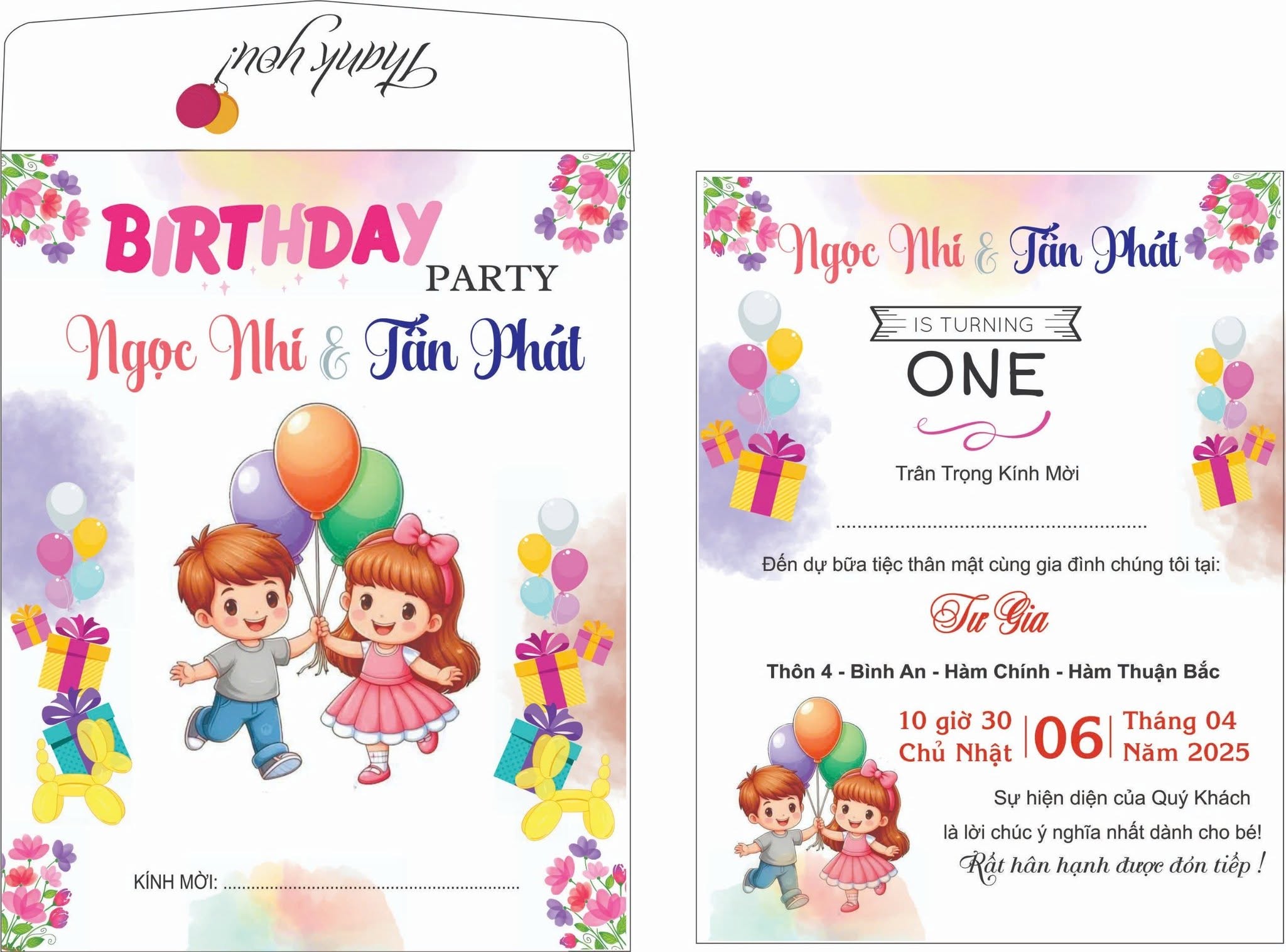 - THIỆP THÔI NÔI CẶP ĐÔI NỤ CƯỜI HỒNG XANH – DẤU ẤN ĐẦU ĐỜI ĐẦY YÊU THƯƠNG Mẫu thiệp thôi nôi "Cặp Đôi Nụ Cười Hồng Xanh" từ Thiệp Cưới Đồng Xoài mang phong cách vui tươi, ấm áp, hoàn hảo cho ngày bé yêu tròn một tuổi, ghi dấu khoảnh khắc đáng nhớ.