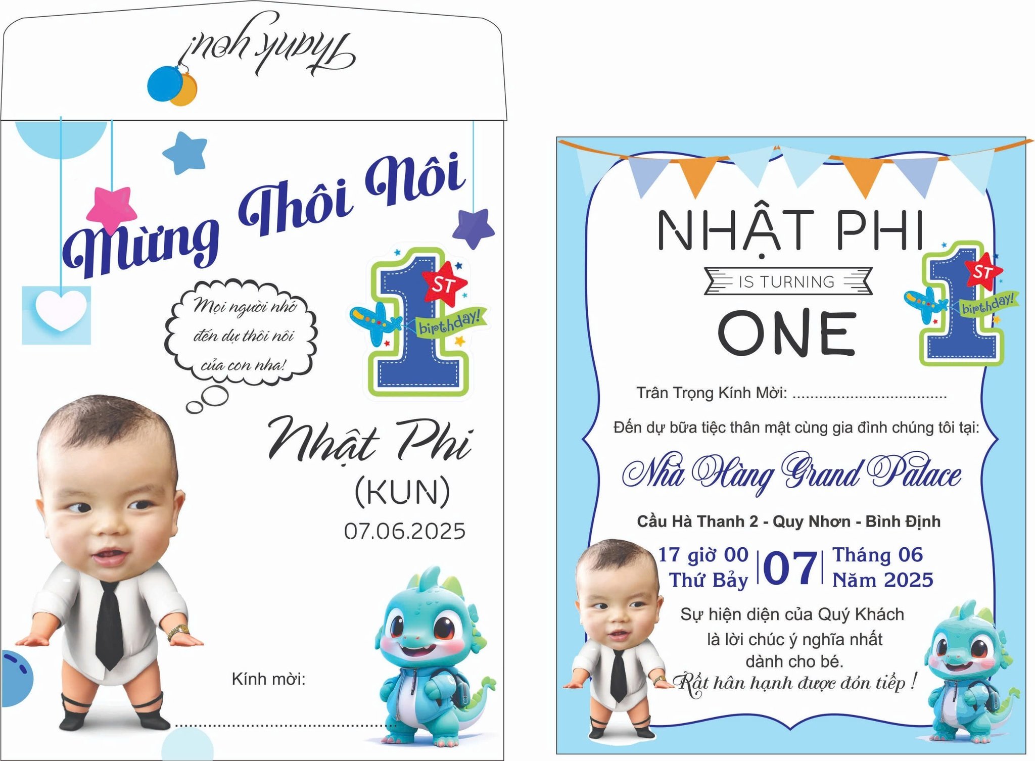 - THIỆP THÔI NÔI LITTLE BOSS VÀ NHỮNG NGƯỜI BẠN KHỦNG LONG – DẤU ẤN ĐẦU ĐỜI ĐẦY PHONG CÁCH Mẫu thiệp thôi nôi Little Boss và Những Người Bạn Khủng Long của Thiệp Cưới Đồng Xoài mang đến sự kết hợp độc đáo giữa phong cách quý ông lịch lãm và nét đáng yêu, tinh nghịch của trẻ thơ. Với tông màu xanh trắng chủ đạo, thiết kế này là lựa chọn hoàn hảo để đánh dấu cột mốc một năm đầu đời của bé yêu một cách trang trọng và ấn tượng.