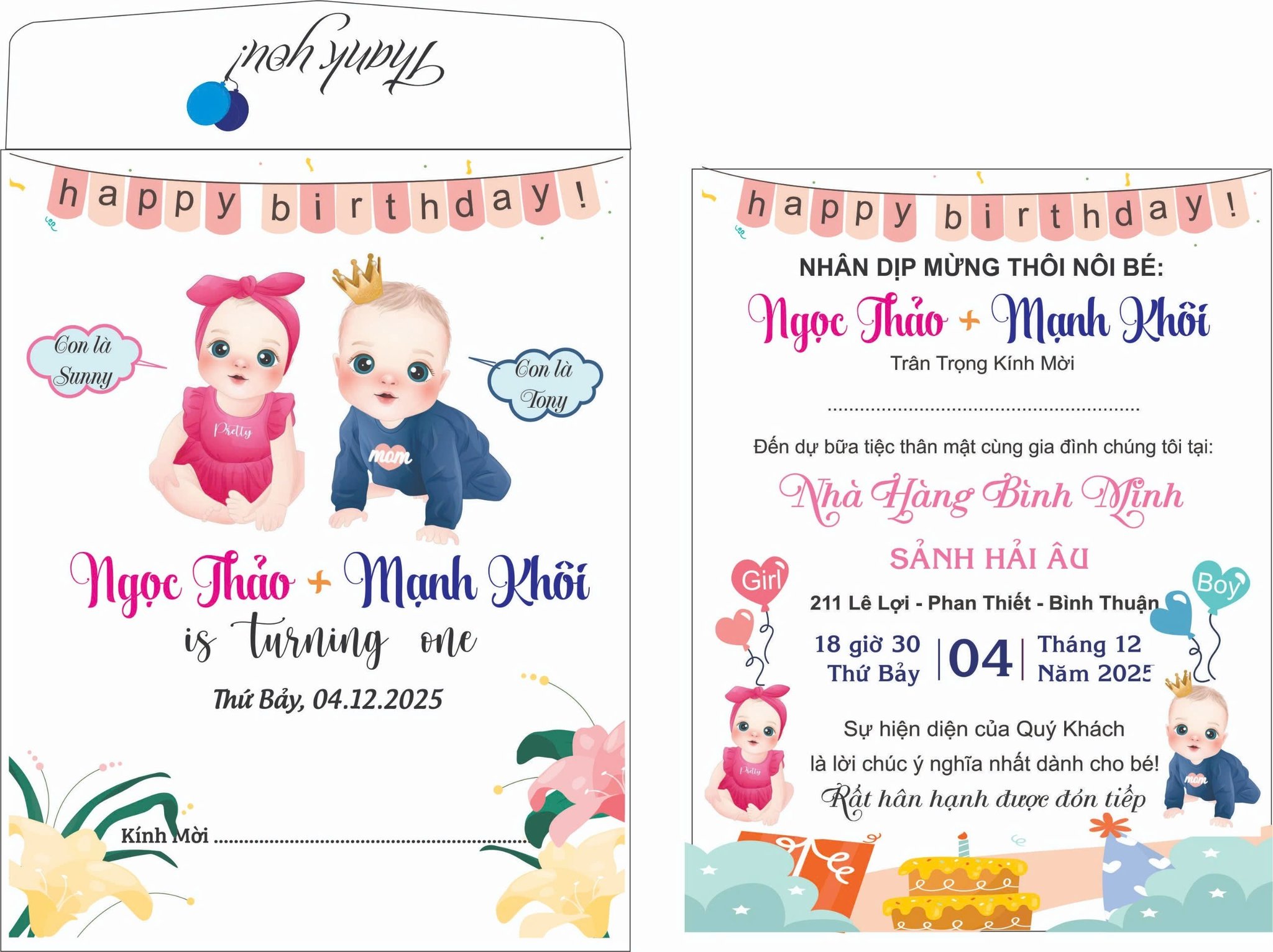 - THIỆP THÔI NÔI SONG SINH HẠNH PHÚC – DẤU ẤN ĐẦU ĐỜI ĐẦY YÊU THƯƠNG Mẫu thiệp thôi nôi song sinh mang phong cách đáng yêu, thiết kế tinh tế với gam màu pastel dịu nhẹ, là lựa chọn hoàn hảo cho bữa tiệc kỷ niệm một năm đầu đời của hai bé.