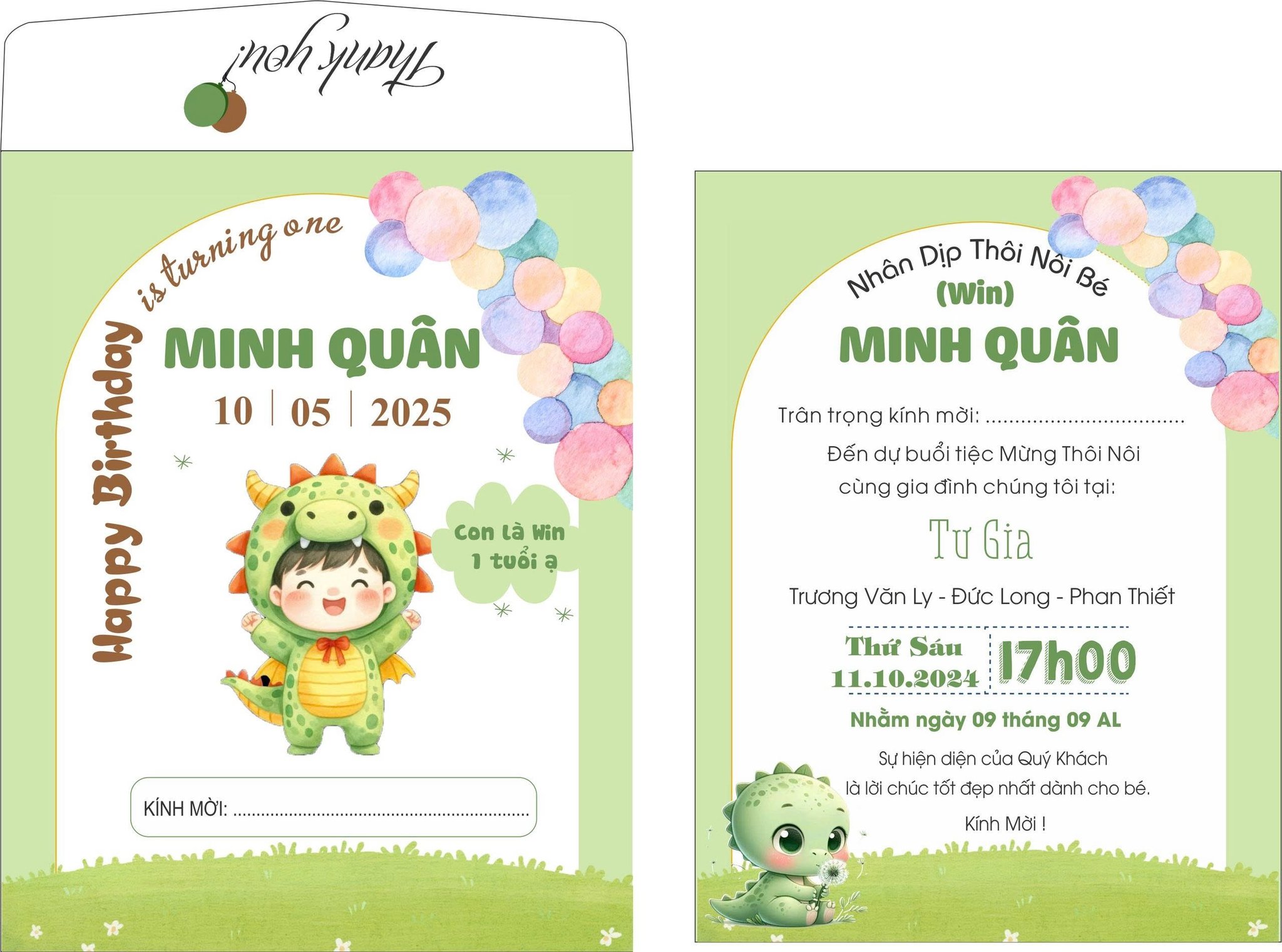 Mẫu thiệp thôi nôi Rồng Nhỏ Xanh Mát từ Thiệp Cưới Đồng Xoài là lựa chọn hoàn hảo để ghi dấu cột mốc một năm đầu đời của bé. Với thiết kế nhẹ nhàng, tươi mới, mẫu thiệp này hứa hẹn mang đến không gian ấm cúng và đầy niềm vui cho buổi tiệc thôi nôi. Phong cách thiệp kết hợp sự ngây thơ của tuổi thơ cùng biểu tượng rồng con may mắn, tạo nên một lời mời độc đáo và ý nghĩa.