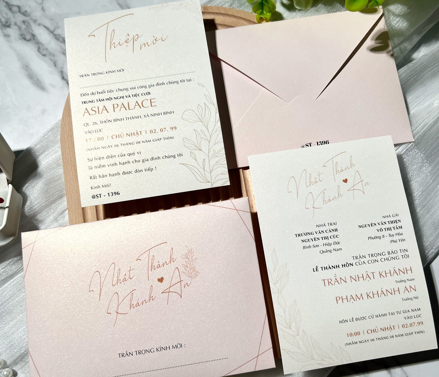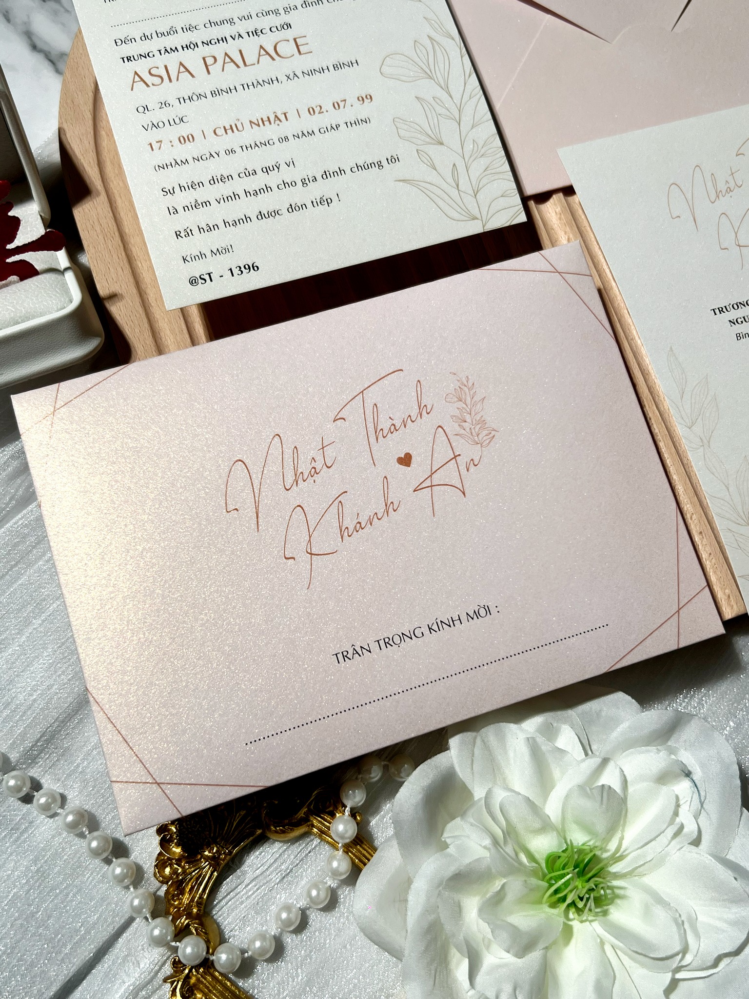 • Mỗi tấm thiệp không chỉ là lời mời mà còn là điểm khởi đầu cho câu chuyện tình yêu vĩnh cửu. Thiệp cưới Hoa Lá Nền Hồng Tinh Tế mang đến vẻ đẹp nhẹ nhàng, thuần khiết với sắc hồng phấn dịu dàng kết hợp cùng họa tiết lá thanh thoát, tạo nên một tổng thể vừa hiện đại vừa lãng mạn. Đây là lựa chọn hoàn hảo cho các cặp đôi yêu thích sự tinh tế, sang trọng và không kém phần ấm áp.