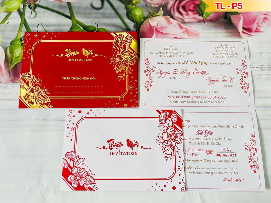 - Mẫu thiệp truyền thống đỏ nhung kiểu ngang nắp chéo ép kim vàng họa tiết hoa và thiệp mời giữa mã TLP-5 kích thước bao thư dán sẵn: 18,5×12,5cm ruột gấp đôi in offset 1 mặt