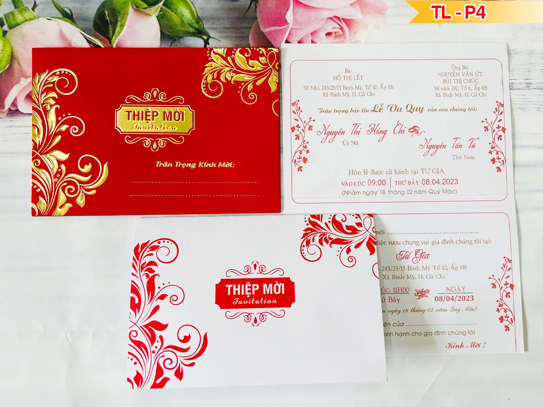 - Mẫu thiệp truyền thống đỏ nhung kiểu ngang nắp chéo ép kim vàng họa tiết hoa và thiệp mời mã TLP-4 kích thước bao thư dán sẵn: 18,5×12,5cm ruột gấp đôi in offset 1 mặt
