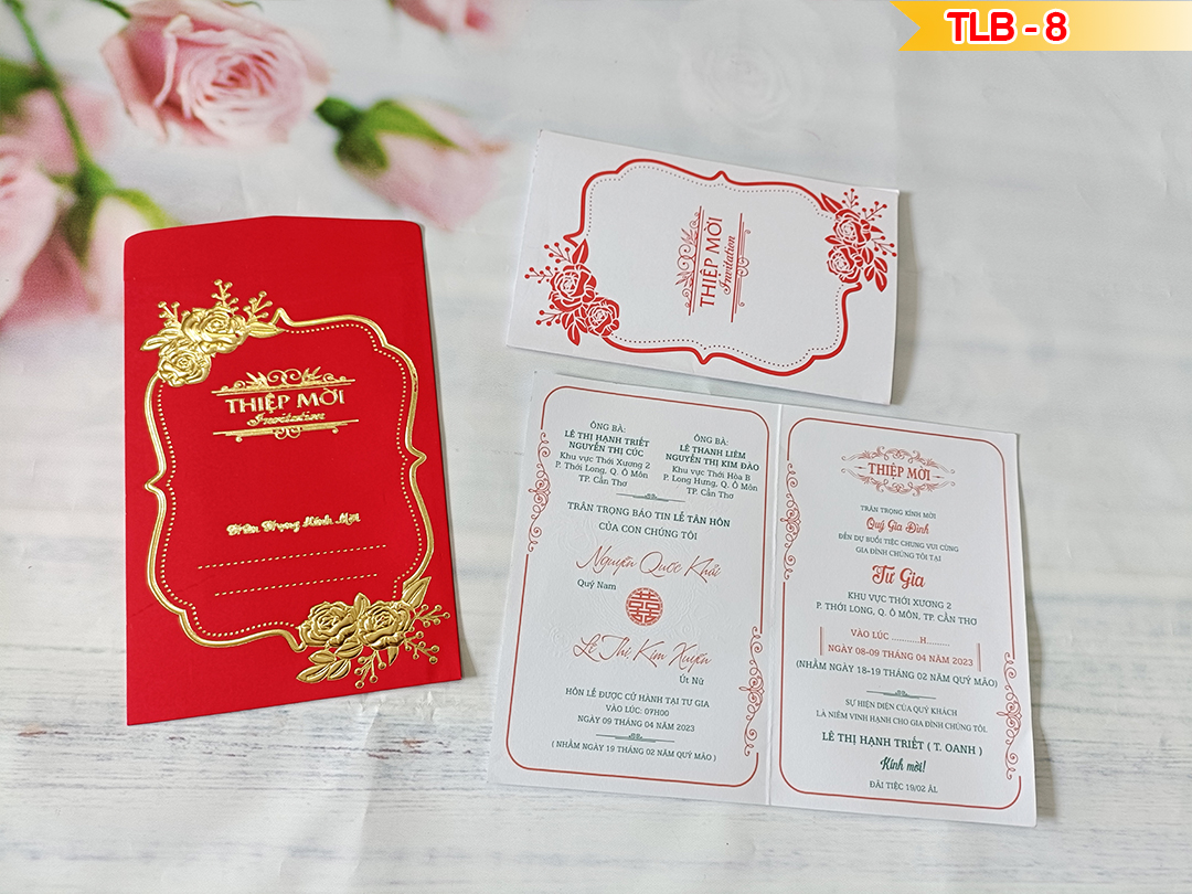 - Mẫu phôi thiệp cưới đỏ nhung đứng trung ép kim vàng mã TLB-8 kích thước bao thư dán sẵn: 12×17,5cm ruột gấp đôi in offset 1 mặt