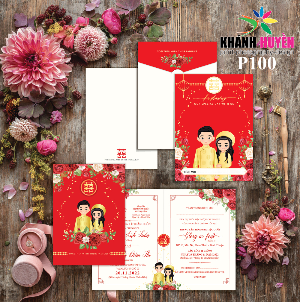 Thiệp Cưới Đồng Xoài ( Xưởng In Khánh Huyền) thiết kế và in theo từng đơn hàng Dâu Rể đặt, Thiệp in hoàn thiện gồm bao thư + ruột + phụ kiện nếu có đã in, dán thành phẩm.