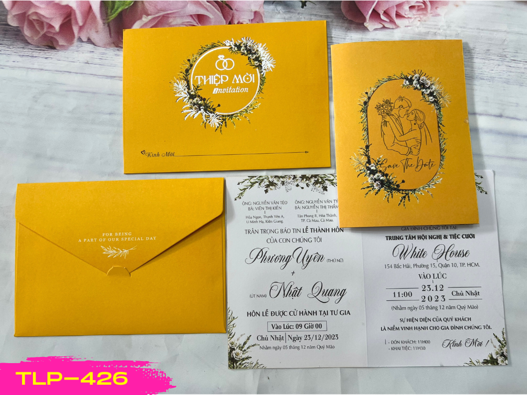 - Mẫu phôi thiệp cưới vàng vòng hoa ép in offset ép kim bạc nhẫn cưới mã TLP-426 Đây là dòng thiệp ép kim sang trọng, giấy kem mỹ thuật dày, ruột và bao thư Bao thư đã dán sẵn thành phẩm in offset 2 mặt và ép kim Ruột gấp 1 tờ in offset 2 mặt Kích thước bao thư khổ ngang 13x18cm, ruột kt 22,5x 16cm
