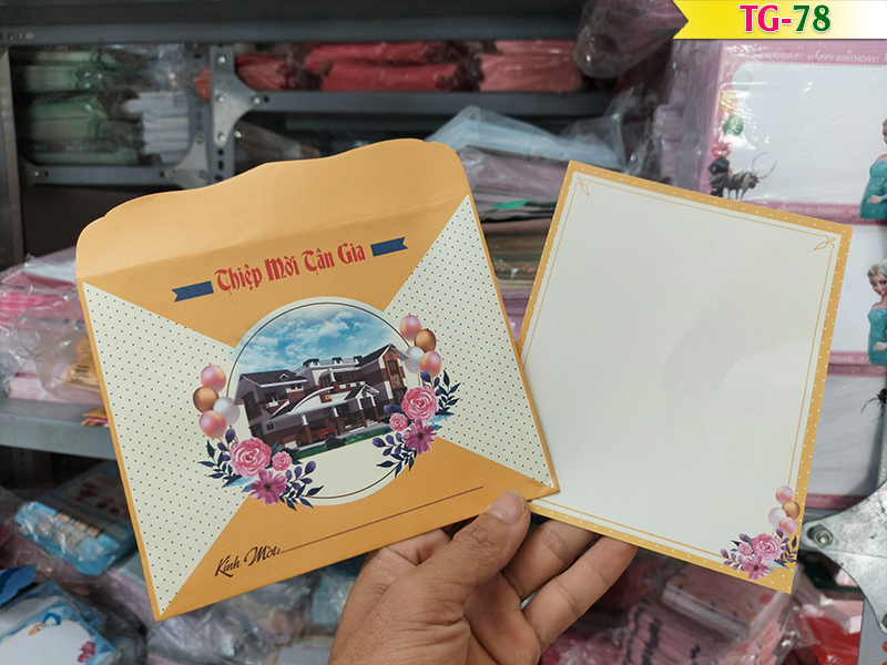 - PHÔI Thiệp Tân Gia Vàng Offset mã TG-78 Kích thước: ngang 13x16cm chất liệu: Giấy kem gân mỹ thuật Bao thư đã dán sẵn, ruột 1 tờ in 2 mặt