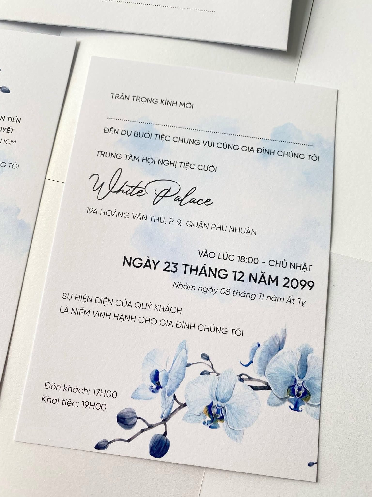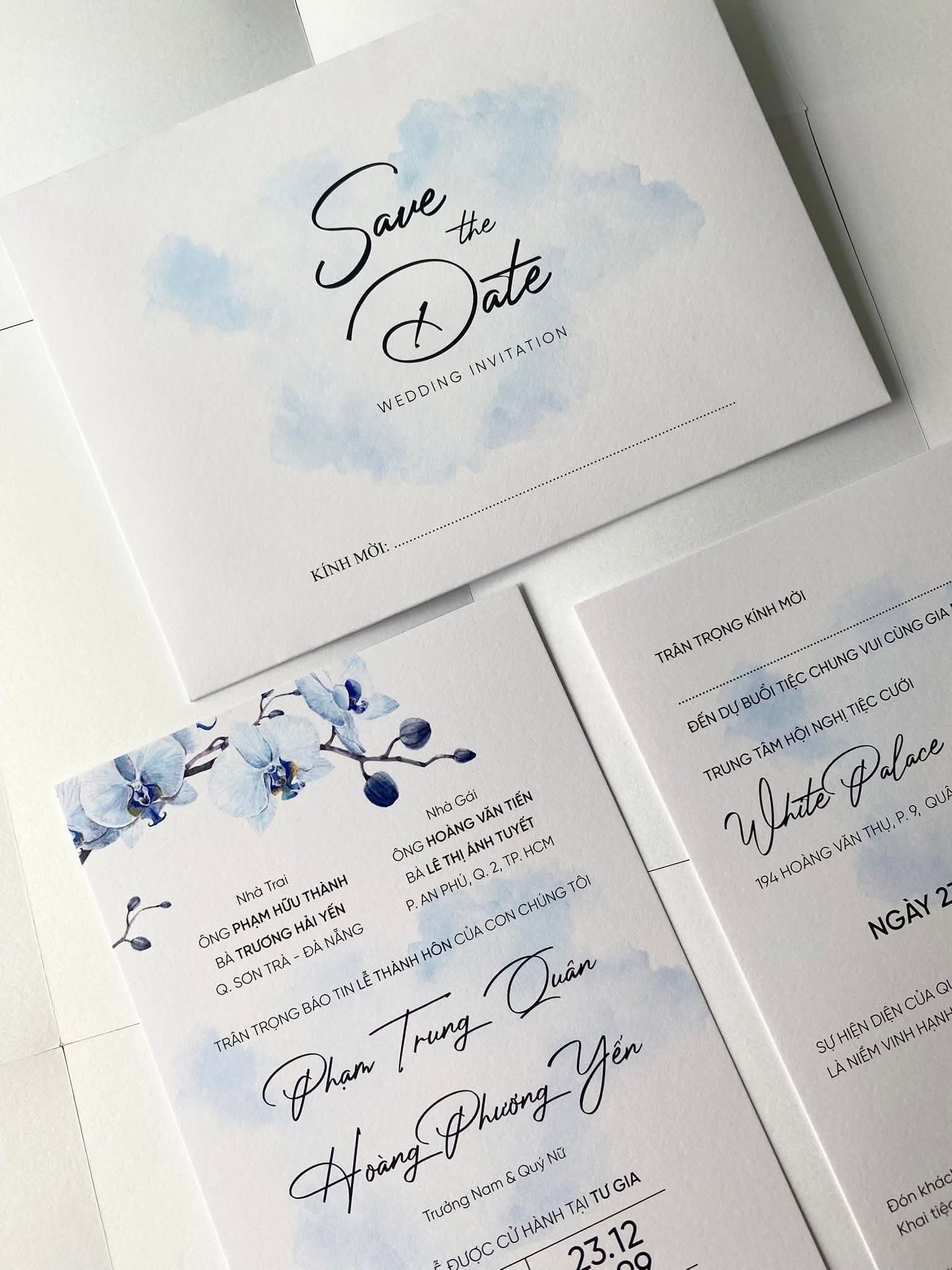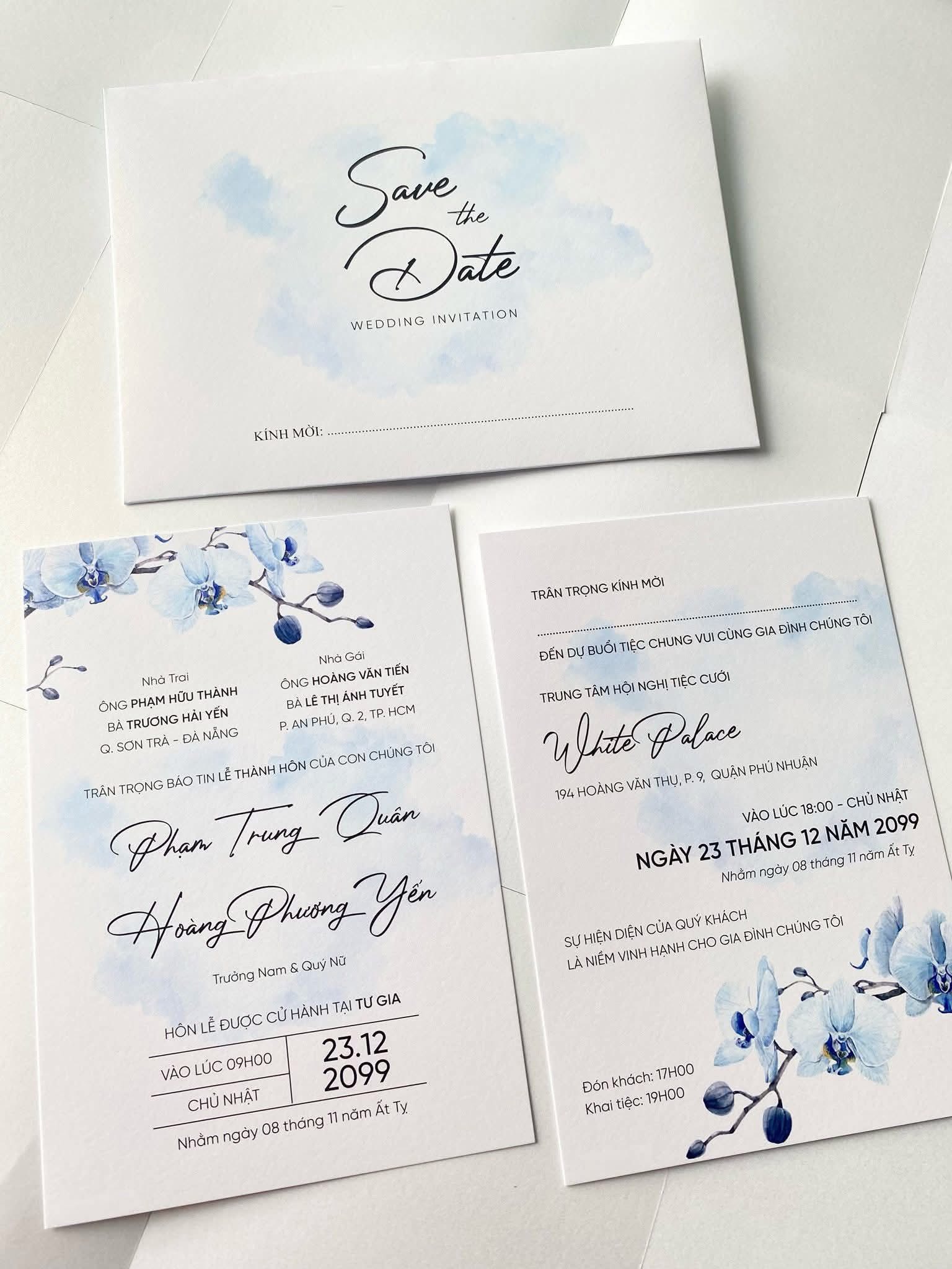 - Mẫu thiệp cưới Blue Orchid Whisper được lấy cảm hứng từ sắc xanh nhẹ nhàng của hoa lan – biểu tượng của sự thuần khiết và khởi đầu hạnh phúc. Thiết kế tối giản, tinh tế với tông màu trắng – xanh pastel giúp tổng thể trở nên sang trọng và thanh lịch.