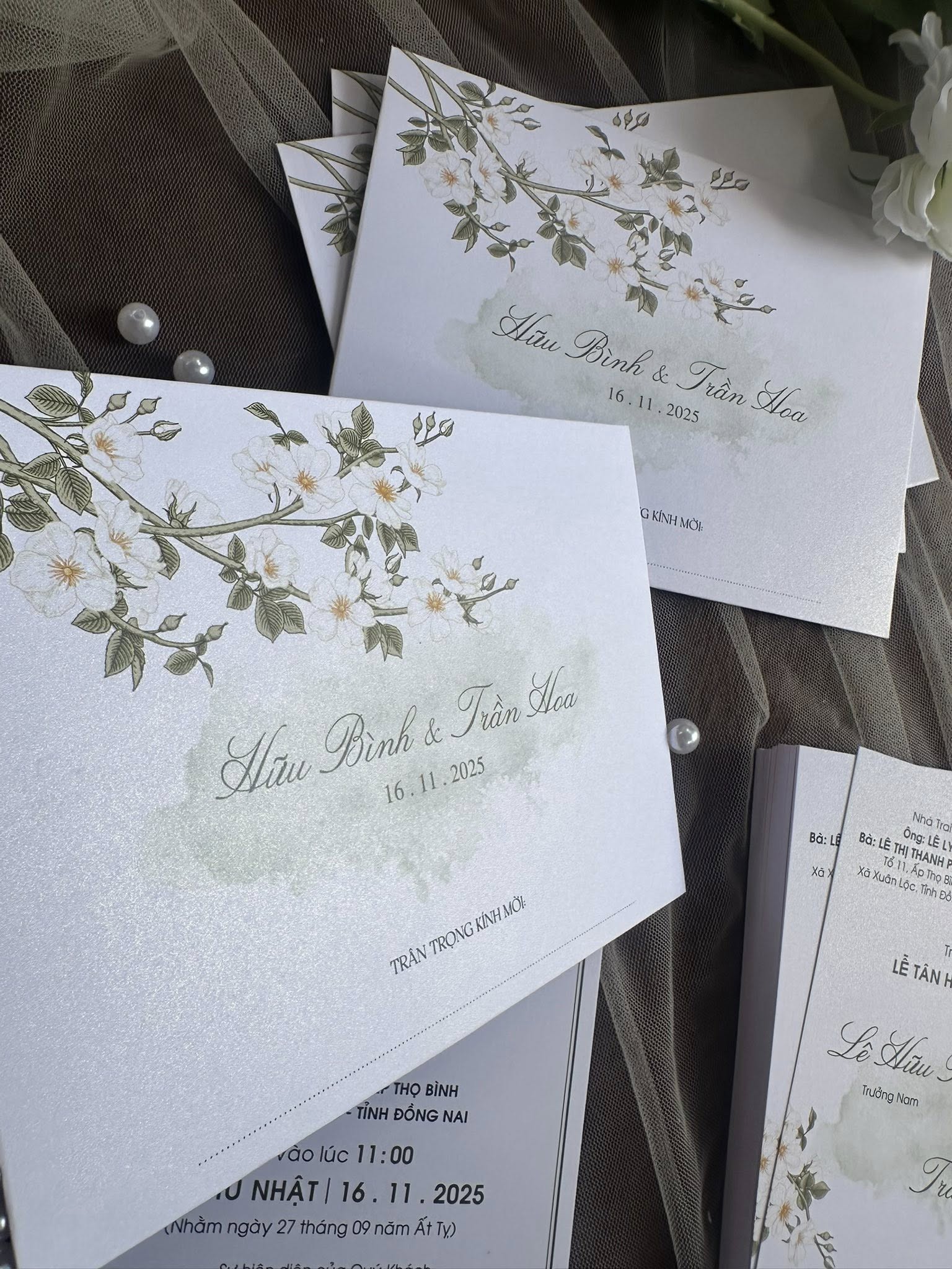 - Mẫu thiệp cưới The Jasmine Whisper được lấy cảm hứng từ sắc hoa nhài tinh khôi và màu xanh pastel nhẹ nhàng. Thiết kế mang hơi thở tự nhiên, trong trẻo, là lựa chọn hoàn hảo cho những cặp đôi yêu phong cách thanh lịch và tối giản.